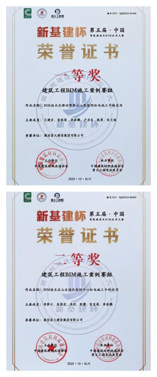 据悉,本届大赛采取企业自愿参赛机制,经过严格的形式审核、在线评审、视频答辩及结果公示等环节,最终确定获奖成果。其中,由集团第二安装公司申报的《BIM技术在潍坊市第三人民医院机电施工中的应用》和《BIM技术在山东海化智控中心机电施工中的应用》分别荣获一等奖和二等奖。